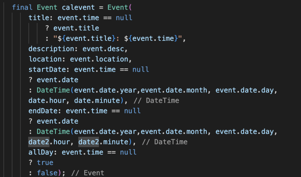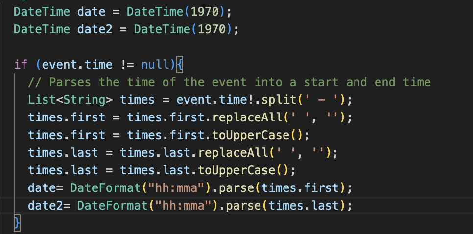 Next, I finally worked on some of the issues for the Hendrix Today app, which is organized and commented in a beautiful way. I worked on changing the add to calendar widget to add the time along with the date of an event. Luckily this was not as hard as I had feared, with me just having to figure out how to parse the time, which is a string stored in Firebase, although getting it just right so it would process was a matter of trial and error. After combining the time, I placed the start and end time into new DateTime variables.